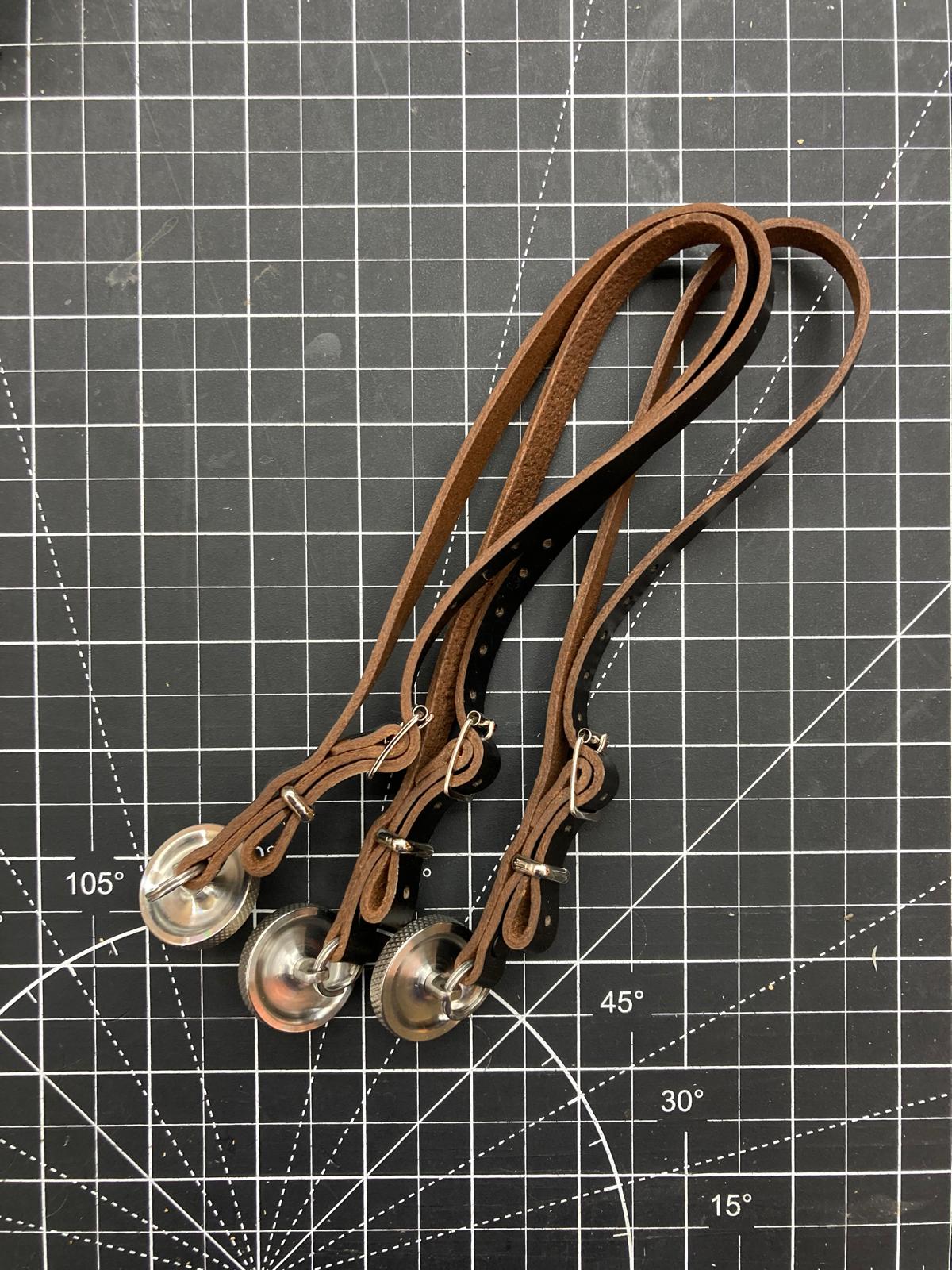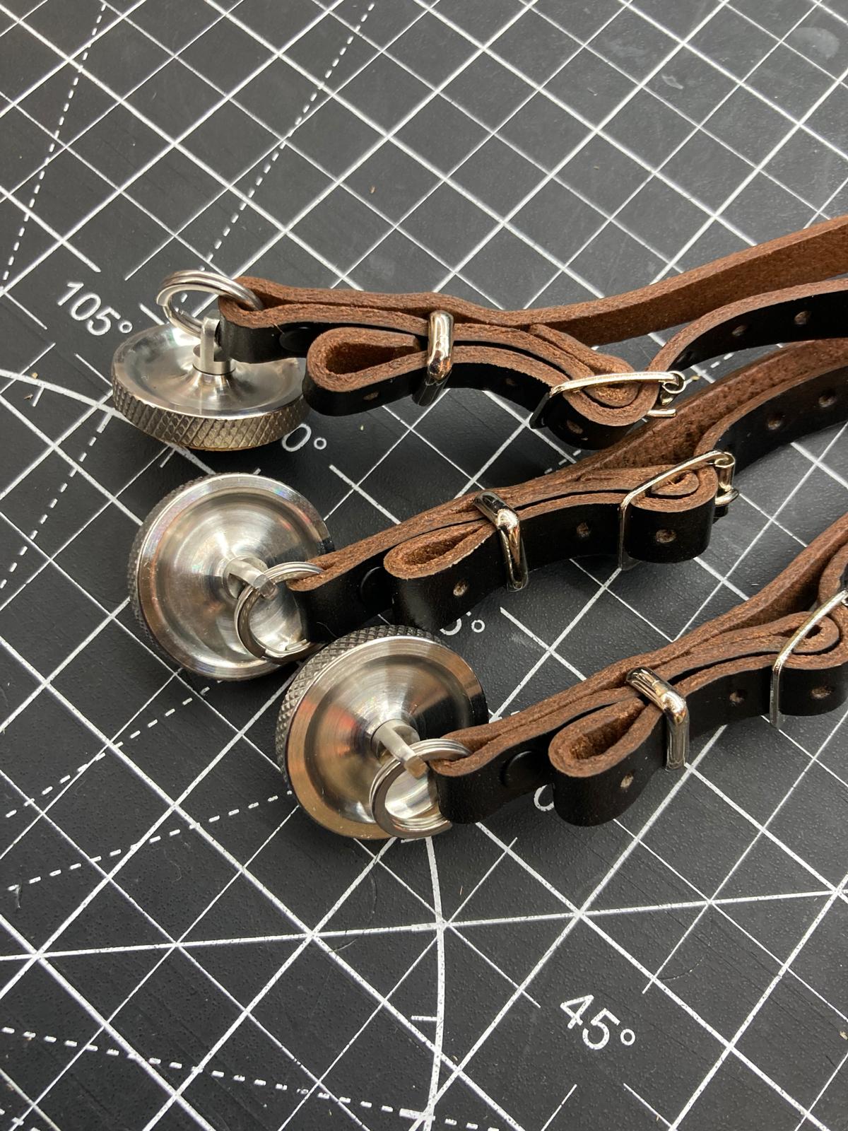PLEASE NOTE THAT THE LEATHER, METAL PLATE AND PAINT FINISH ON THE RIVETS WILL ALL WEAR WITH USE - JUST AS ON THE ORIGINAL STRAPS. WE LOVE THE WAY THIS PATINA DEVELOPS WE HOPE YOU WILL, TOO.