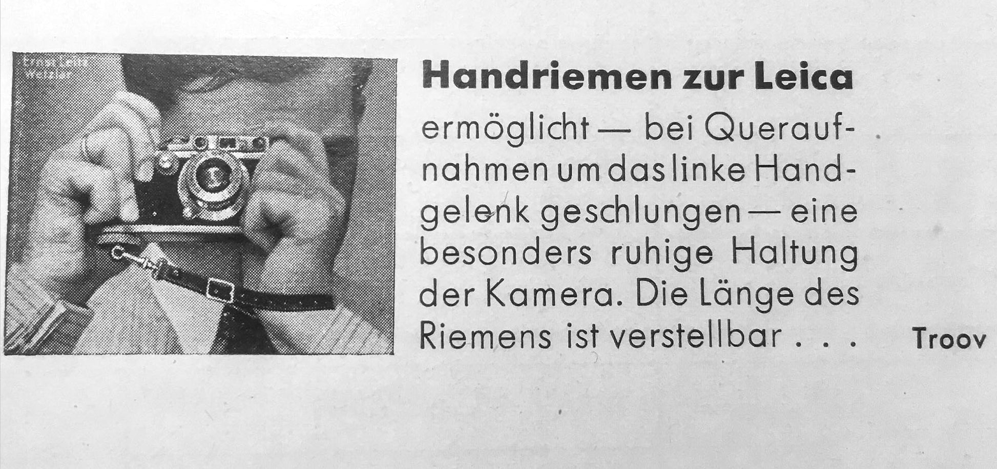 You will see a picture of the original Leica catalogue entry for the TROOV. The text translates as 'The Leica allows for a particularly steady camera position when looped around the left wrist for horizontal shots. The strap length is adjustable'